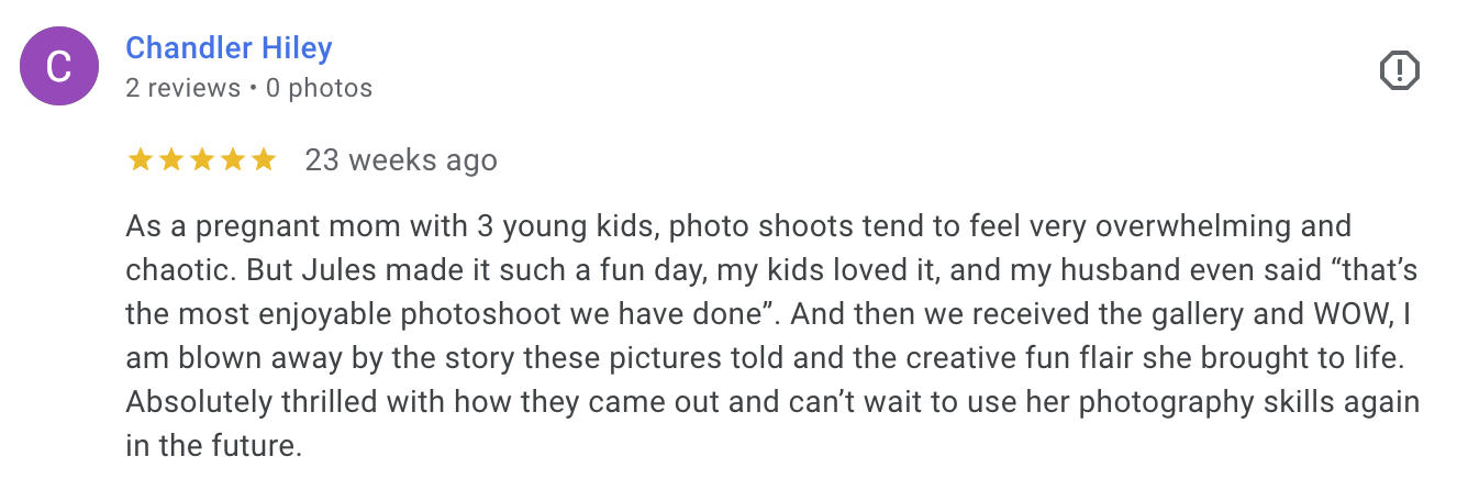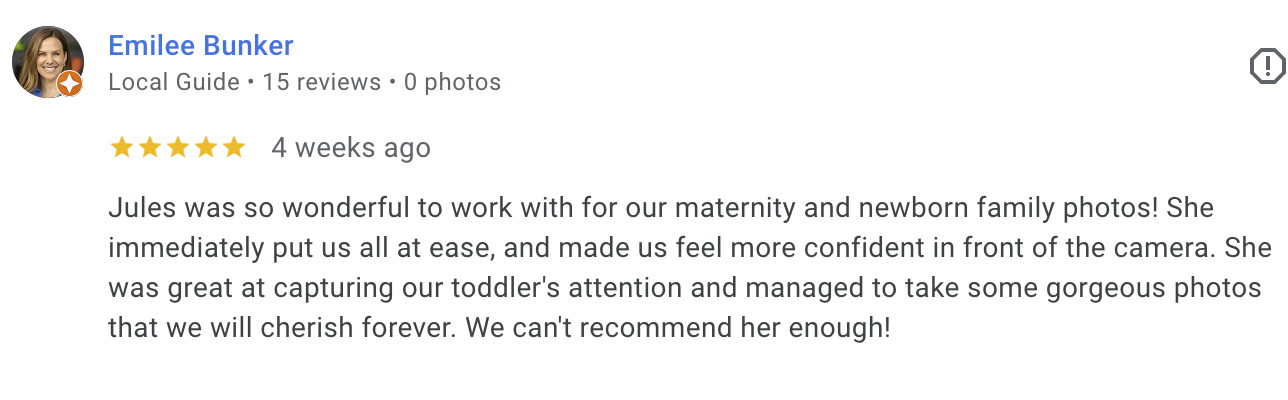 Tell me what you’re looking for and when you’re looking to get it done. This will include things like, your due date, studio or in-home, and how many people you’re looking to include.